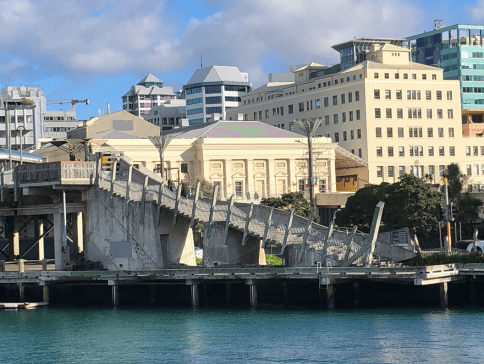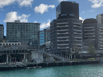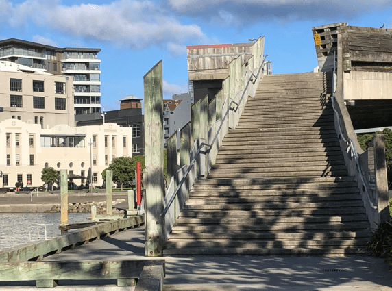 The Boat Shed, to the right in the Whairepo Lagoon (Whaiepo is the Maori name for eagle rays who are considered the guardians of Lagoon), across from the Jervois Quay and the City to Sea Bridge and crossing the Quay to the Civic Centre.